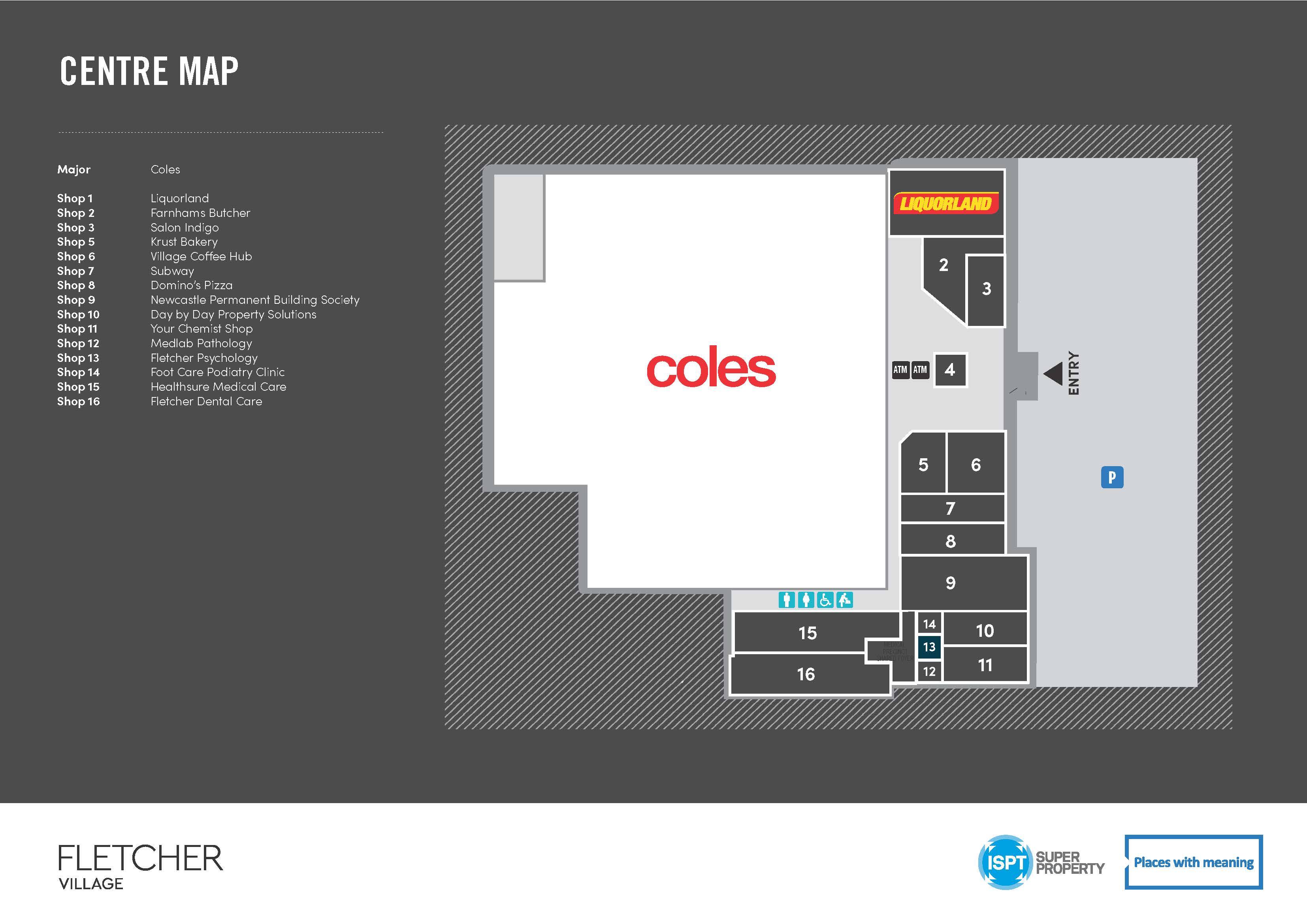 Stores Major. Coles Shop 6. Village Coffee Hub Shop 12. Medlab Pathology Shop 1. Liquorland Shop 7. Subway Shop 13. Fletcher Psychology Shop 2. Farnhams Butcher Shop 8. Domino’s Pizza Shop 14. Foot Feet Podiatry Shop 3. Salon Indigo Shop 9. Newcastle Permanent Building Society Shop 15. Healthsure Medical Centre Shop 10. Day by Day Property Solutions Shop 16. Fletcher Dental Care Shop 5. Krust Bakery Shop 11. Your Chemist Shop Download a PDF of our floorplan